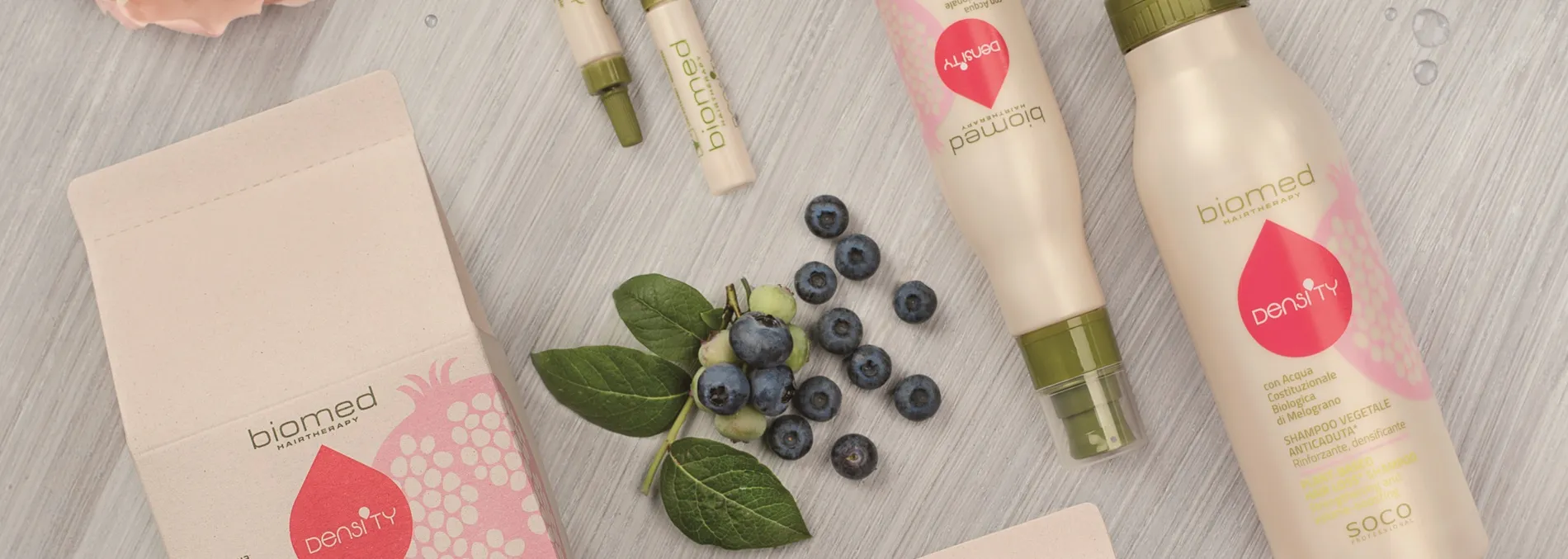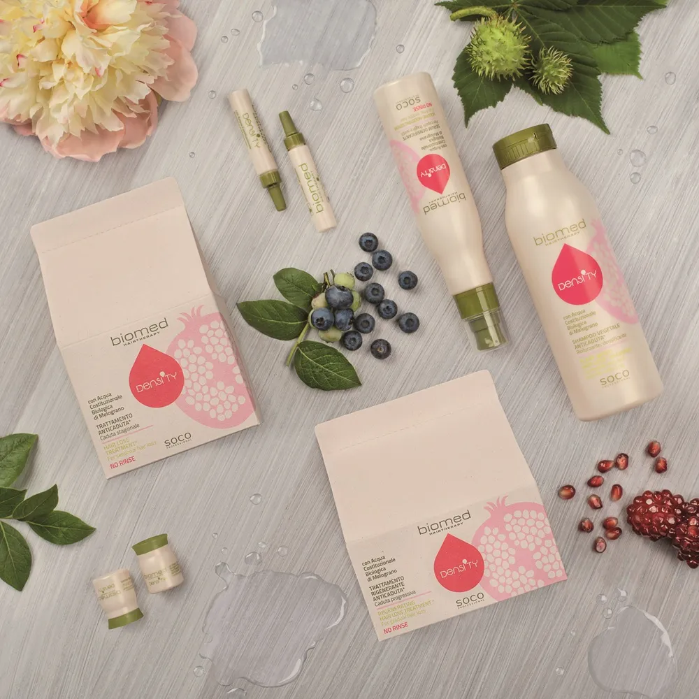 Die Produkte von Biomed Density stärken und verdichten kraftloses Haar und beugen somit Haarausfall vor. Der Hauptbestandteil ist biologisches Granatapfel-Zellwasser, das durch die antioxidative und vitaminspendende Wirkung Haarwuchs besonders fördert. Weitere pflanzliche Inhaltsstoffe unterstützen die Kräftigung an der Wurzel.