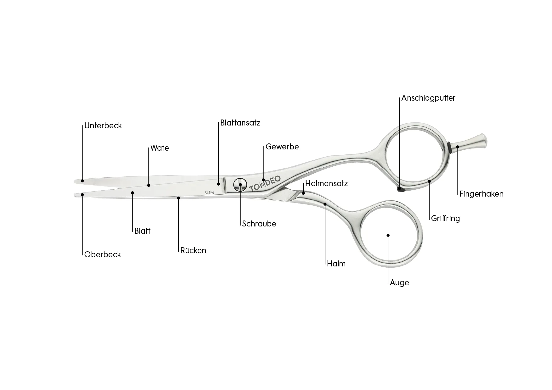 Viele sehen nur, dass sie schneidet. Doch die Friseurschere ist eigentlich ein wahres Meisterstück. Sie hat nicht nur eine besondere Form, ein ausgeklügeltes aber filigranes Schraubsystem, sondern auch ganz spezielle Schneidblätter. Diese Blätter sind so konzipiert, dass sie beim Schneiden das Haar festfassen, sodass sie das Haar nicht ausfransen oder gar abreißen. Der Griffbereich einer Friseurschere hat eine ganz besondere Form und ist auf einen sicheren Halt und präzise Schnitte ausgelegt. All das und mehr macht sie zu einem Spitzenprodukt. Was genau macht eine gute Friseurschere alles aus? Wir haben alle wichtigen Qualitätsmerkmale von Friseurscheren für euch im Überblick. Und so heißen die Elemente der Profi Schere: