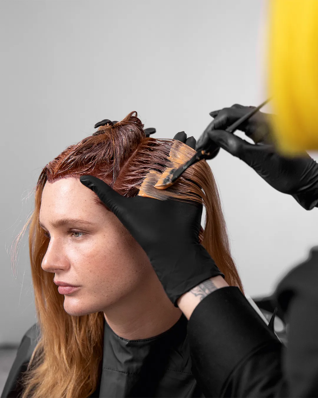 Hier empfehlen wir zum Beispiel Schwarzkopf Igora Royal oder Goldwell Elumen. Beim Färben von grauen Ansätzen ist wichtig, dass die Haare richtig abgeteilt und die Kopfhaut millimetergenau mit Farbe bedeckt werden.