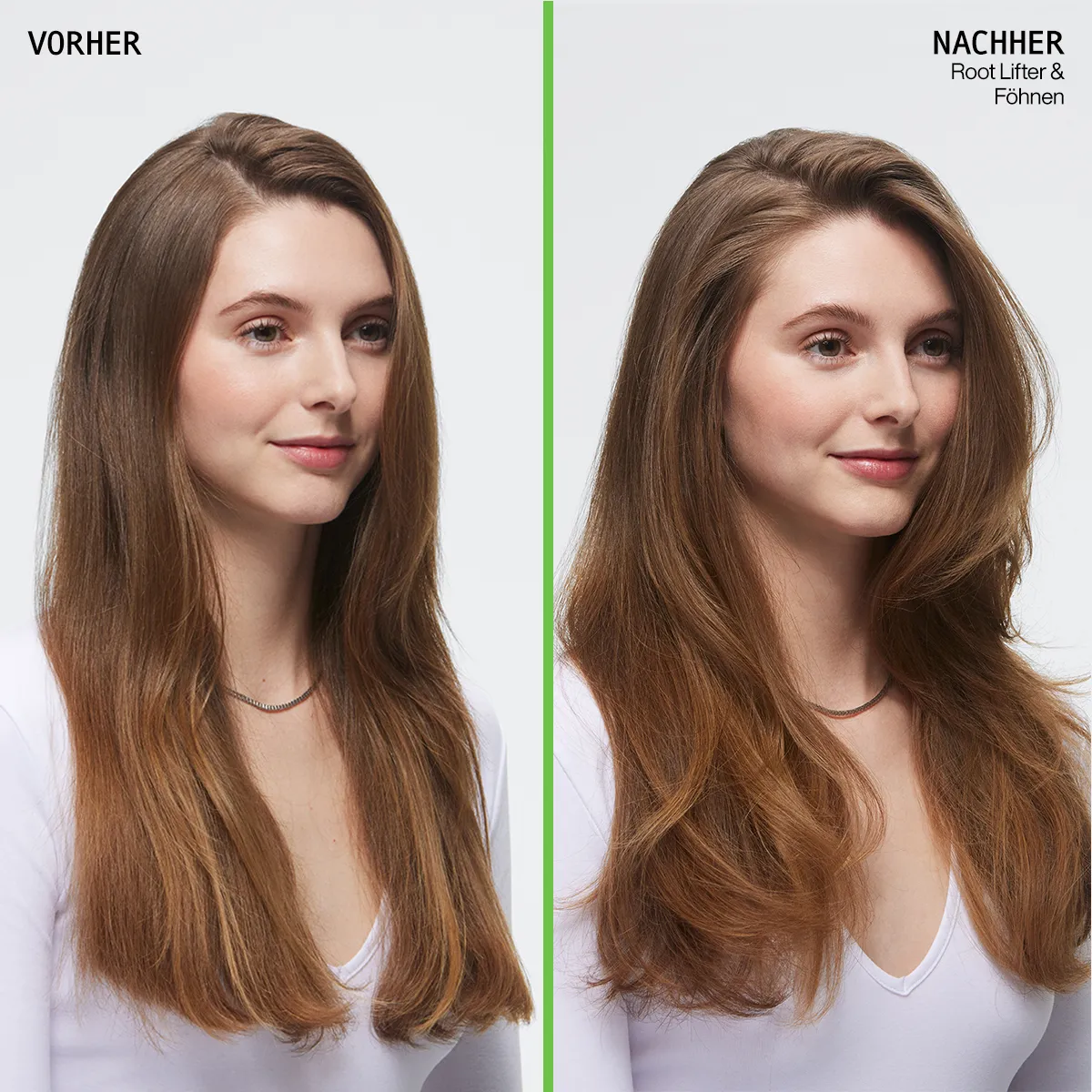 Hitzestyling-Tools wie Glätteisen oder Föhn sollten sparsam eingesetzt werden, damit die Haare nicht unnötig strapaziert werden. Häufiges Waschen und Colorationen sollten ebenso vermieden werden. Ein Haarfestiger, wie der Redken Root Lifter, wirken wahre Wunder im Bezug auf Haarfülle.