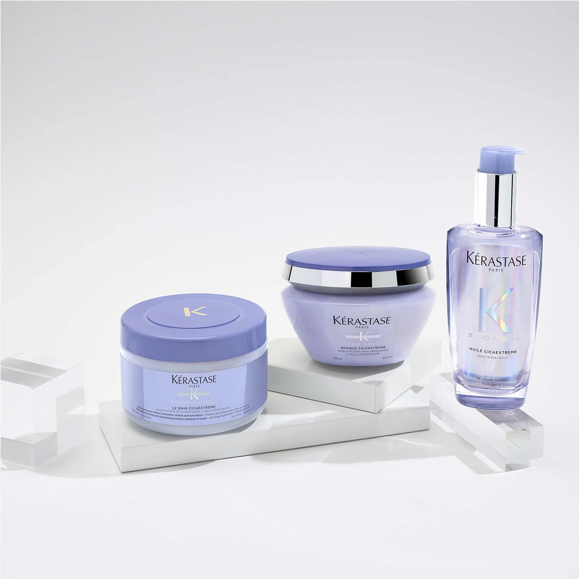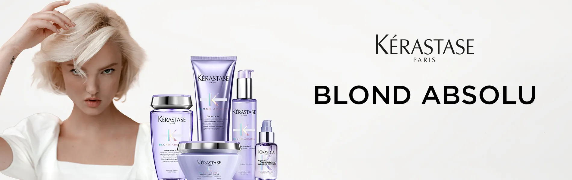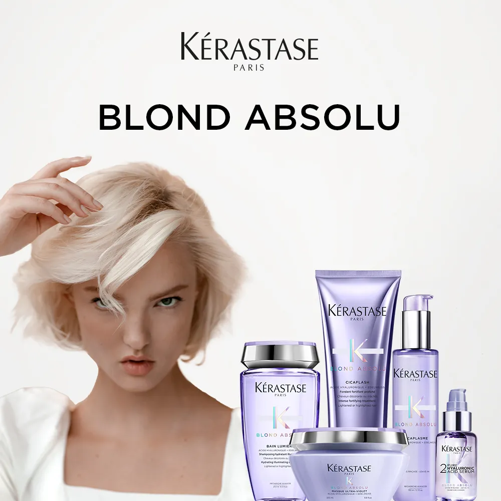 Vom Anti-Gelbstich Kérastase Blond Absolu Bain Ultra-Violet über das Kérastase Blond Absolu Bain Lumière Glanz-Shampoo bis hin zum Kérastase Blond Absolu Cicaflash Conditioner, der Kérastase Blond Absolu Masque Ultra-Violet Anti-Gelbstich Maske und dem Kérastase Cicaplasme Leave-In bietet die Linie ein ganzheitliches Pflegeprogramm für sensibilisiertes, blondes Haar.