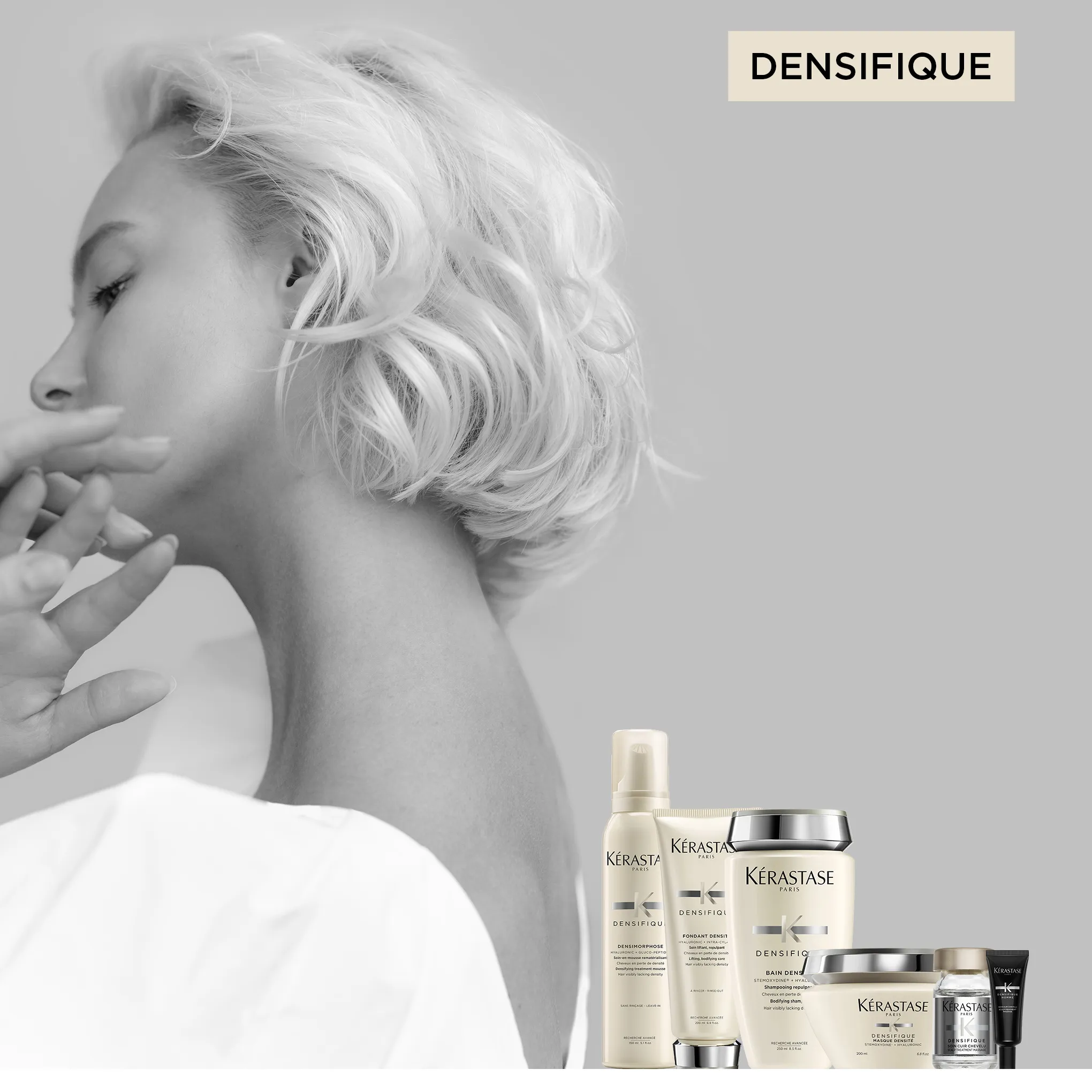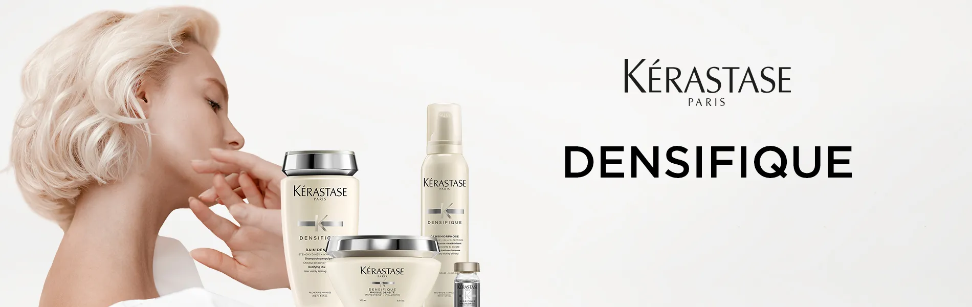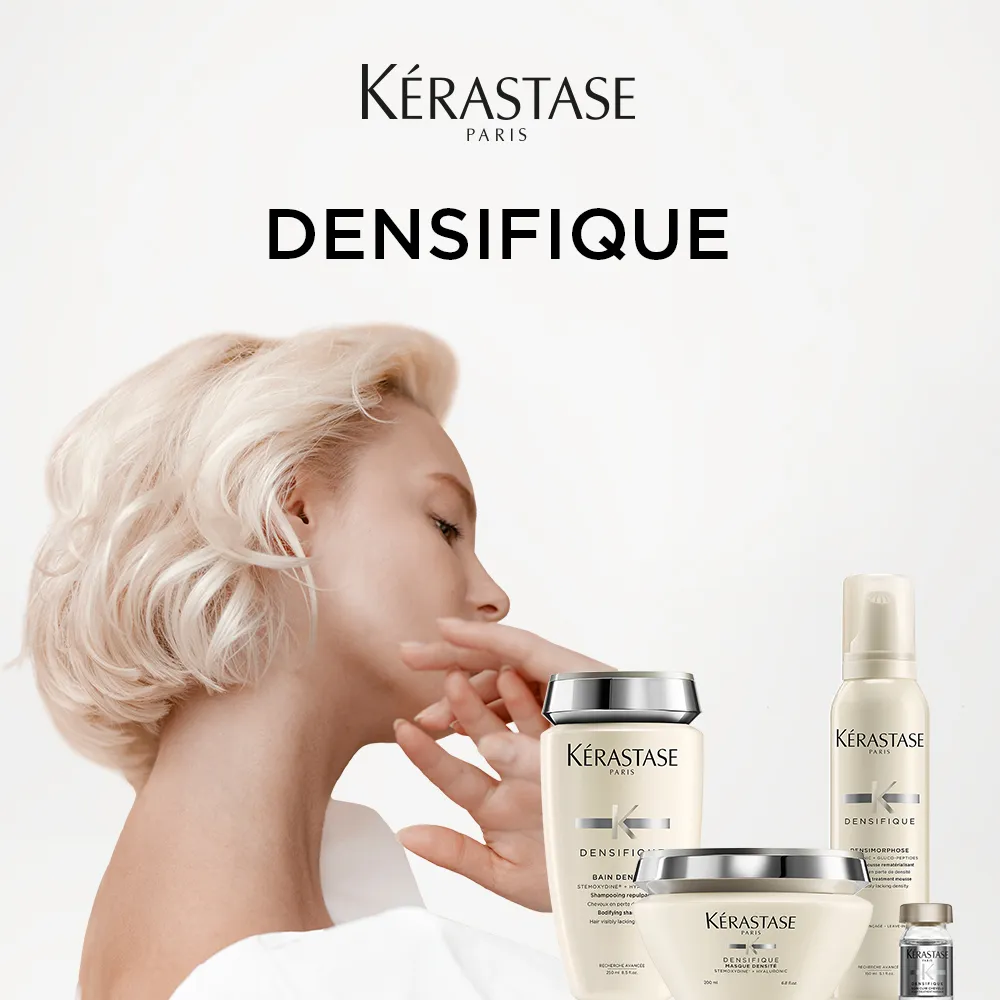 Kérastase Densifique ist eine Pflegeserie für Haar mit geringer Dichte. Dünner werdendem Haar wird sichtbar entgegengewirkt. Die Serie besteht aus sechs Produkten, die von Shampoo über Schaumfestiger bis zur Haarkur reichen.