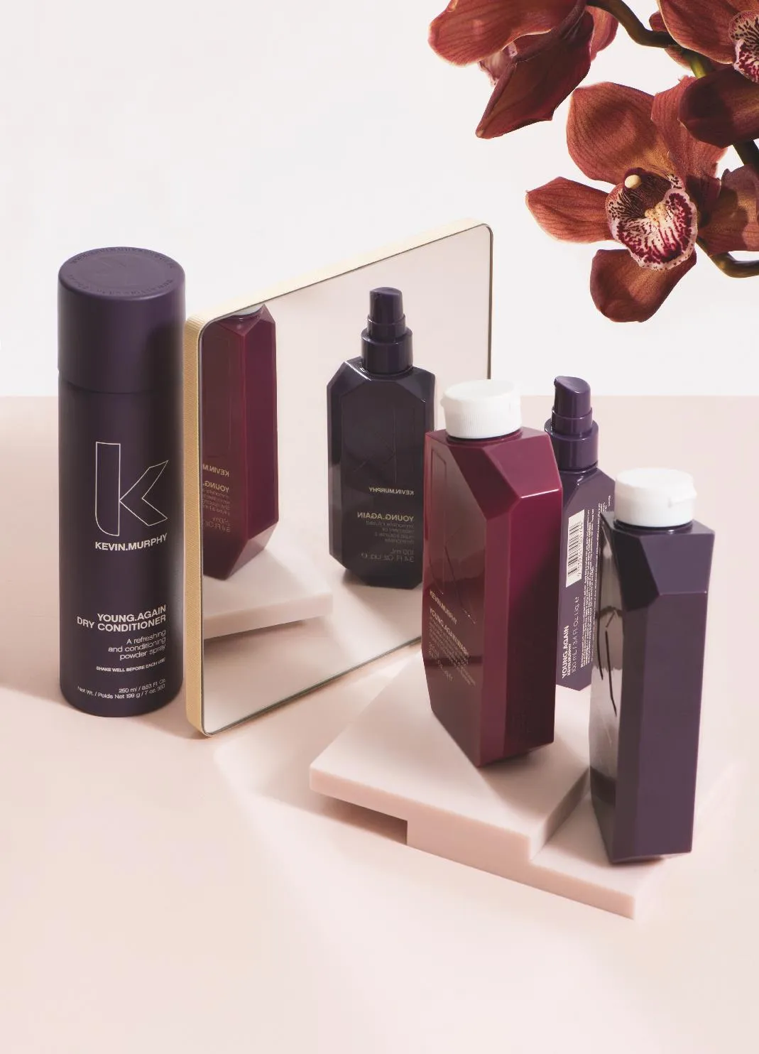 Reifes Haar erstrahlt wieder in jugendlichem Glanz dank Kevin.Murphy Young Again. Die Pflegelinie besteht aus Shampoo, Conditioner, einer speziellen Haarmaske, dem Immortelle Haaröl und einem Dry Conditioner.