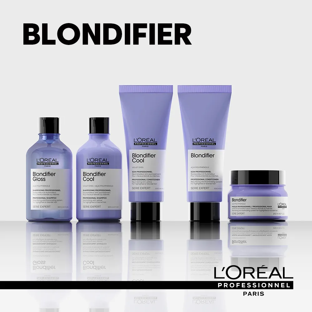 Naturblondes, gefärbtes und blondiertes Haar erhält mit den Série Expert Blondifier Produkten aus dem Hause L’Oréal Professionnel professionelle Pflege. Ausgestattet mit einem hochwertigen Farbschutz sorgen die Produkte für strahlendes Blond, das weit über seine Verhältnisse an Brillanz und Intensität gewinnt. Weil die Linie exakt auf die Bedürfnisse von Blondinnen zugeschnitten ist, wirkt die Linie effektiv Gelbstich entgegen. Unerwünschte Gelbtöne werden wirksam entfernt, sodass ein klarer, kühler Blondton entsteht.