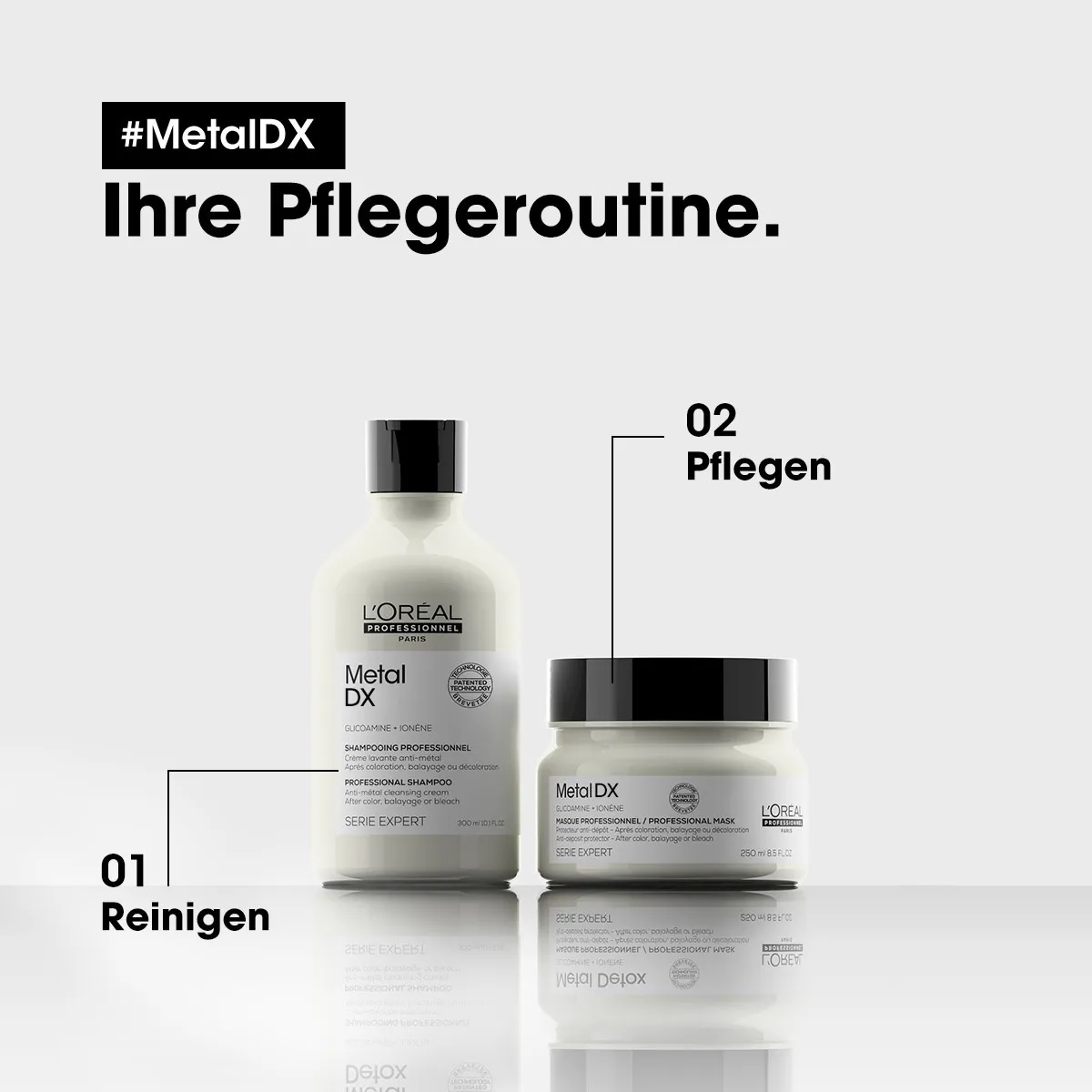 L’Oréal Professionnel Paris Série Expert Metal DX ist die erste Pflegeserie, die Haarbruch, Farbveränderungen und Haarschäden vorbeugt, bevor sie entstehen. Durch innovative Technologie dringen die Pflegestoffe in die Haarfaser ein und neutralisiert dort schädliche Metalle. Das Ergebnis: Gestärktes Haar, verlässliche Farben & perfekter Glanz! Die komplette Serie ist für alle Haartypen geeignet und nicht nur auf Balayage oder Färbungen beschränkt. Metal DX beugt Haarbruch, Farbveränderungen und Frizz vor, indem es Metalle im Haar neutralisiert.