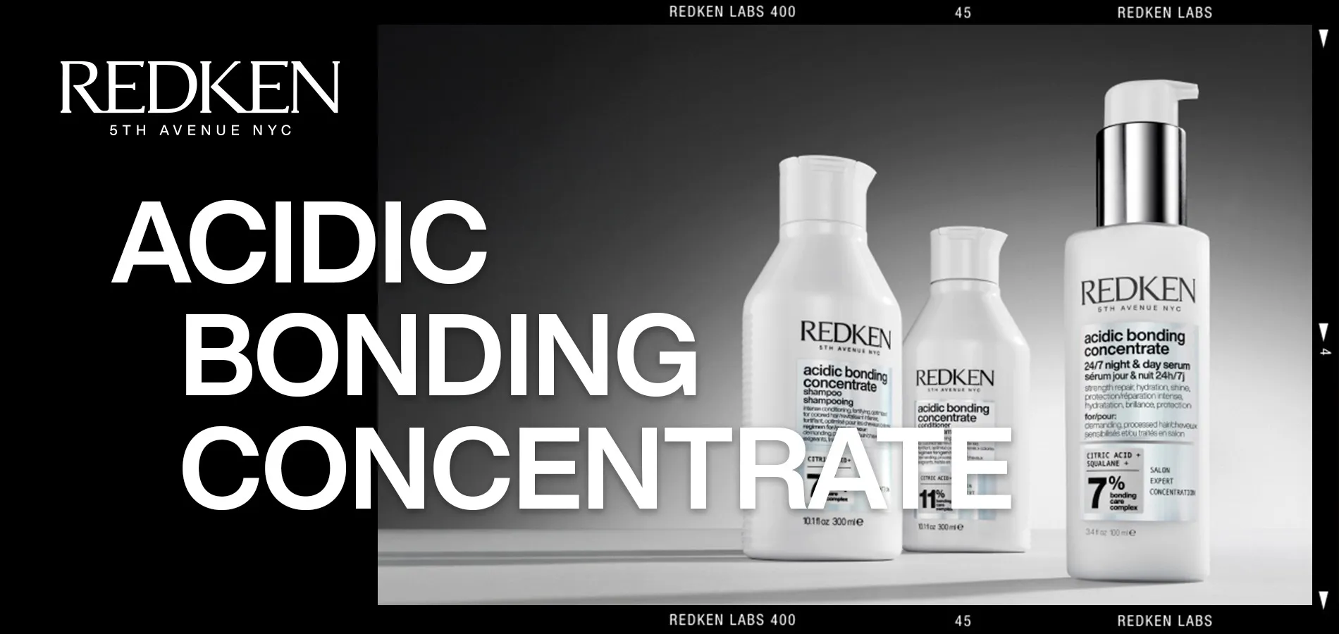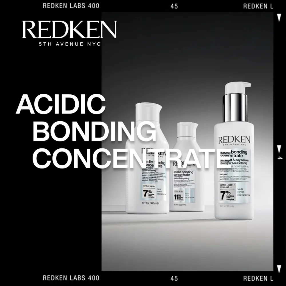 Die Redken Acidic Bonding Concentrate Pflegeserie besteht aus dem Redken Acidic Bonding Concentrate Shampoo, dem Conditioner und dem abschließenden Leave-In Concentrate. Alle drei Produkte sind mit dem Bonding-Care-Komplex ausgestattet und enthalten Zitronensäure. Die reparierende Formel in Redken ABC stärkt geschwächte Sulfitbindungen im Haar und minimiert Haarbruch. Das Redken Acidic Bonding Concentrate Shampoo enthält 7% des Bonding Care Complexes, im Conditioner sind 11% enthalten und im Leave-In Treatment 5%.