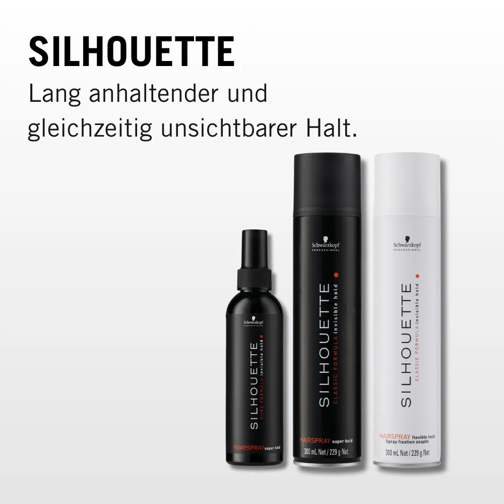 Silhouette ist die professionelle Styling Linie von Schwarzkopf. Die Produkte enthalten reine Inhaltsstoffe und mikrofeine Filmbildner für unsichtbaren und zugleich langanhaltenden Halt. Sie lassen sich gleichmäßig und einfach im Haar verteilen, ohne das Haar zu beschweren. Sie sorgen für voluminöse Stylings mit brillantem Glanz. Die Produkte trocknen schnell und verkleben das Haar nicht.