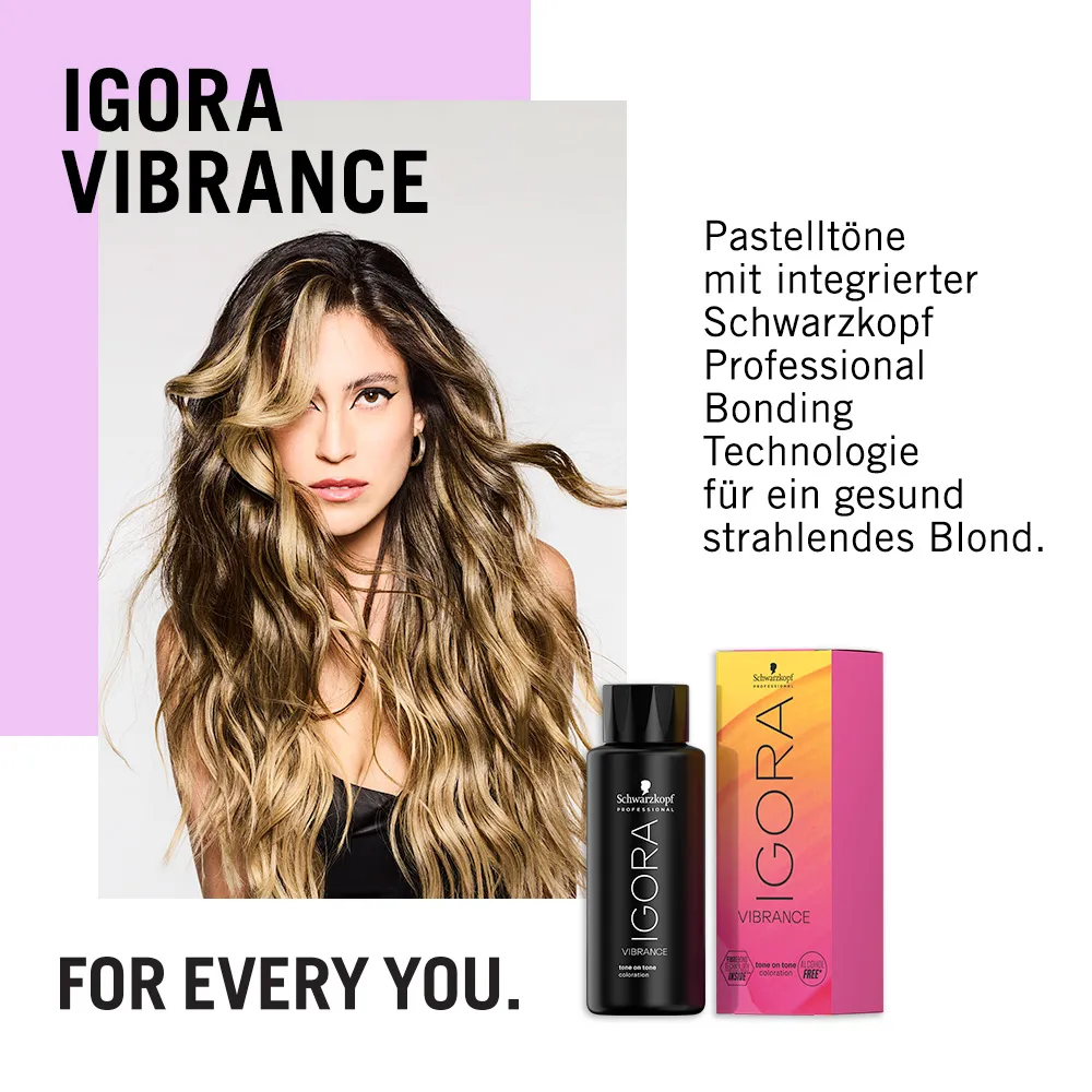 Mit Igora Vibrance hat Schwarzkopf high-end und Ton-in-Ton Colorationen entwickelt. Die ammoniakfreien Creme-Colorationen sorgen für ultimativen Glanz und höchste Farbintensität, die bis zu 25 Haarwäschen halten und bis zu 70% Weißhaar-Abdeckung bieten. Die Haarfarbe ist dank der ammoniakfreien Formulierung sanft zum Haar, so wird die Haargesundheit aufrechterhalten. Durch die cremige Textur sind die Igora Vibrance Töne leicht zu mischen, aufzutragen und lassen sich auch ganz leicht wieder ausspülen. Trotz der schonenden Formel lassen sich mit Igora Vibrance Tönen exakte und intensive Farbergebnisse erzielen und perfekte Farbausgleiche schaffen.