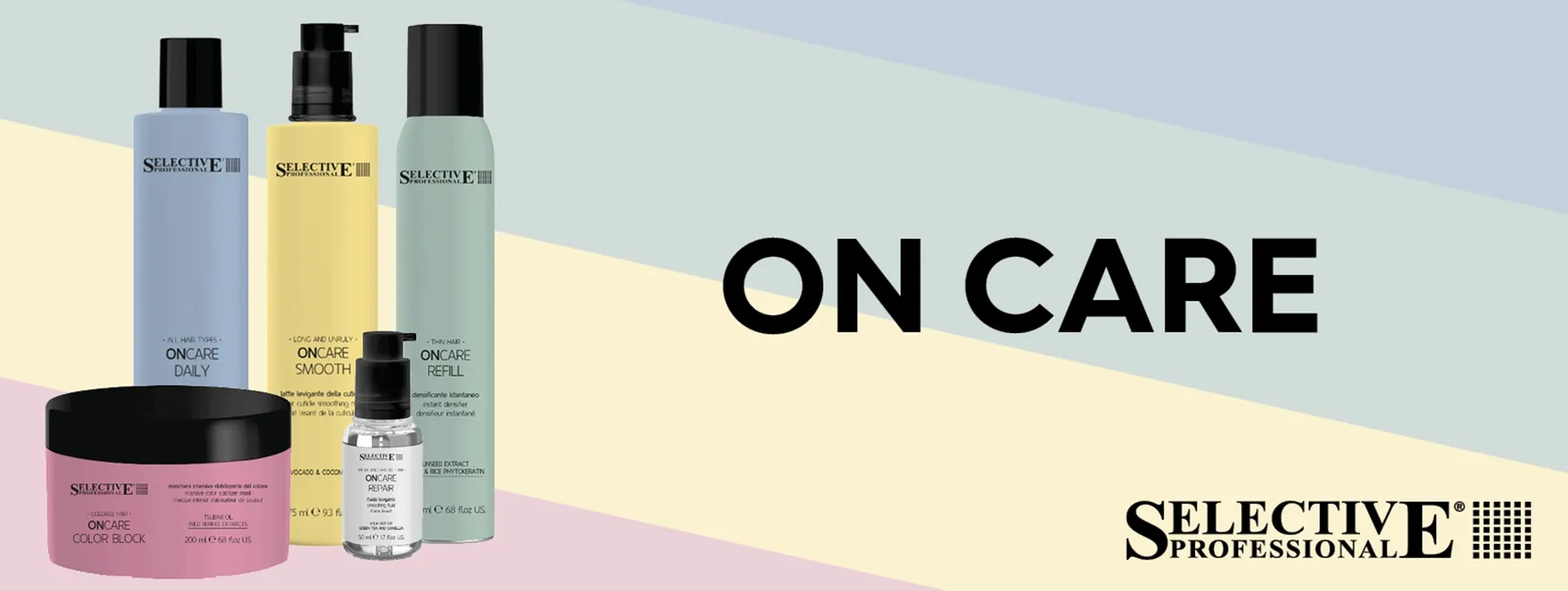 Selective Professional Formeln sind schonend für Haare und Kopfhaut. Ausgewählte Duftnoten betören die Sinne bei jeder Anwendung. On Care bietet folgende Produkt Benefits: