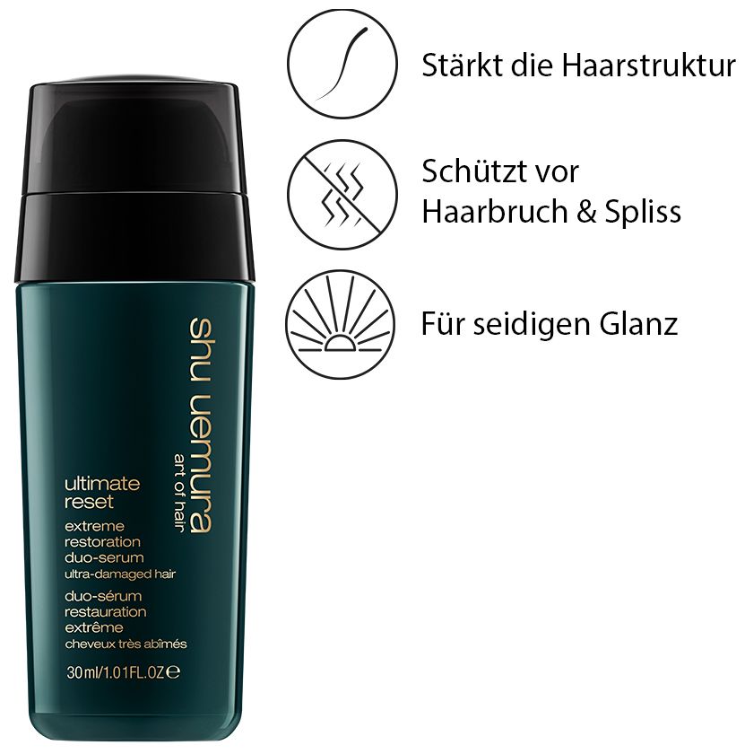Das Shu Uemura Ultimate Reset Duo-Serum spiegelt die perfekte Balance von Styling und Pflege in einem Produkt wieder. Es ist die ideale Ergänzung in der Pflegeroutine für stark strukturgeschädigtes Haar. Die pflegende Seite des Produktes ist mit Reisextrakt angereichert, welcher vor Haarbruch beim Styling schützt und die Spitzen versiegelt. Die Styling Seite des Duo-Serums enthält srs® Mikro-Wachse, die das Haar vor Hitze schützen und ein flexibles Styling ermöglichen. Das Styling wird dadurch unkompliziert ermöglicht ohne zusätzliche Produkte verwenden zu müssen oder das Haar zu befeuchten.