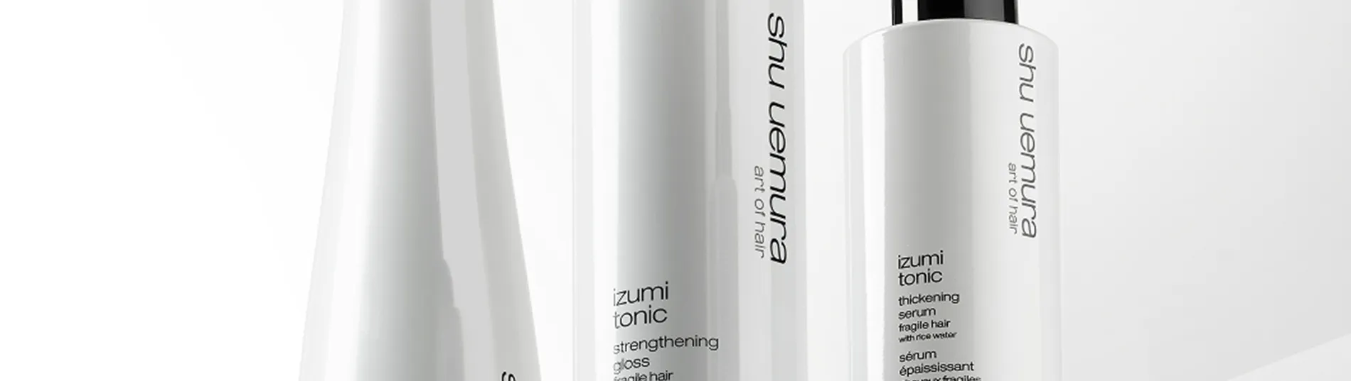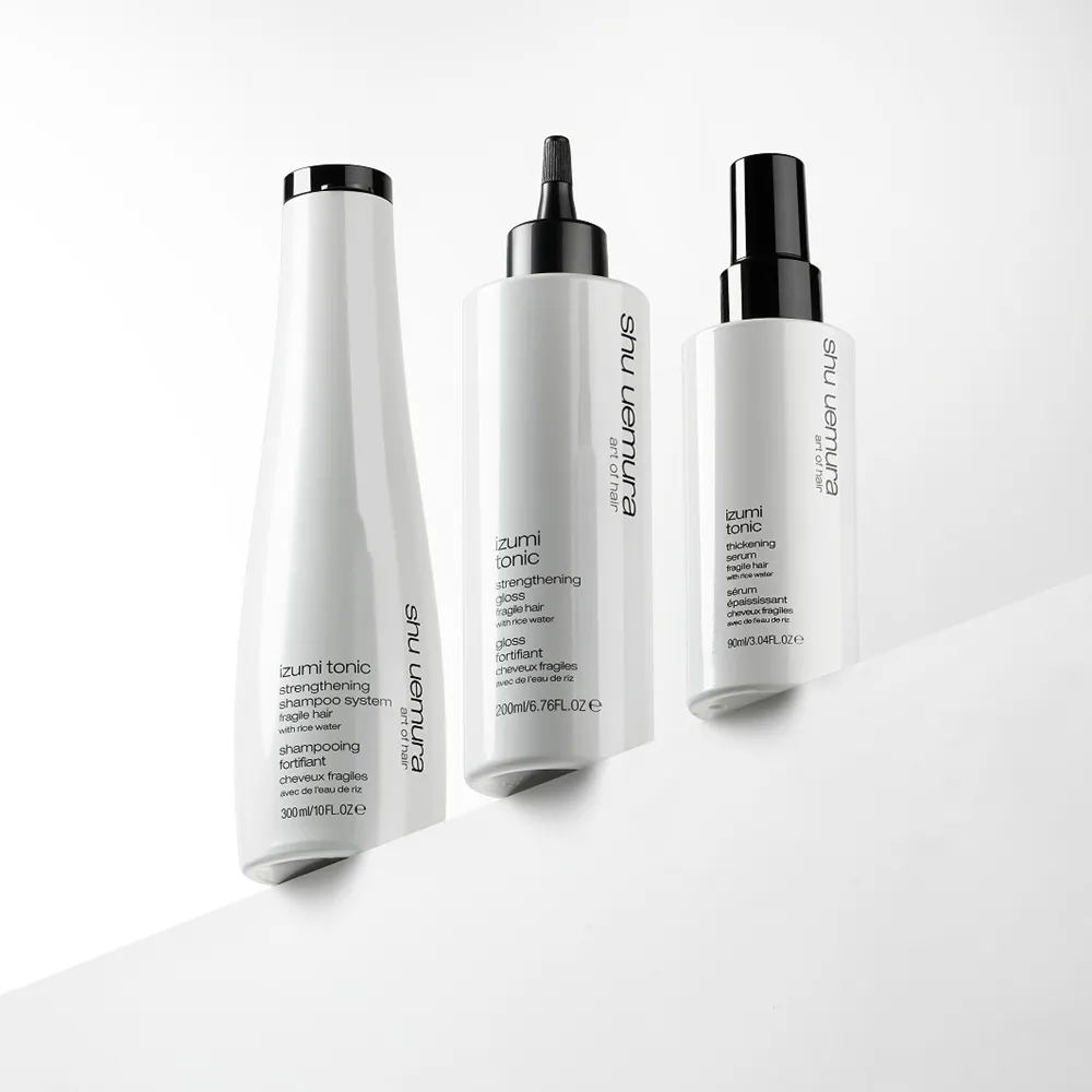 Shu Uemura Izumi Tonic ist eine Serie für brüchiges und strapaziertes Haar. Die Produkte enthalten Reiswasser, was stärkende und verdichtende Eigenschaften aufweist.