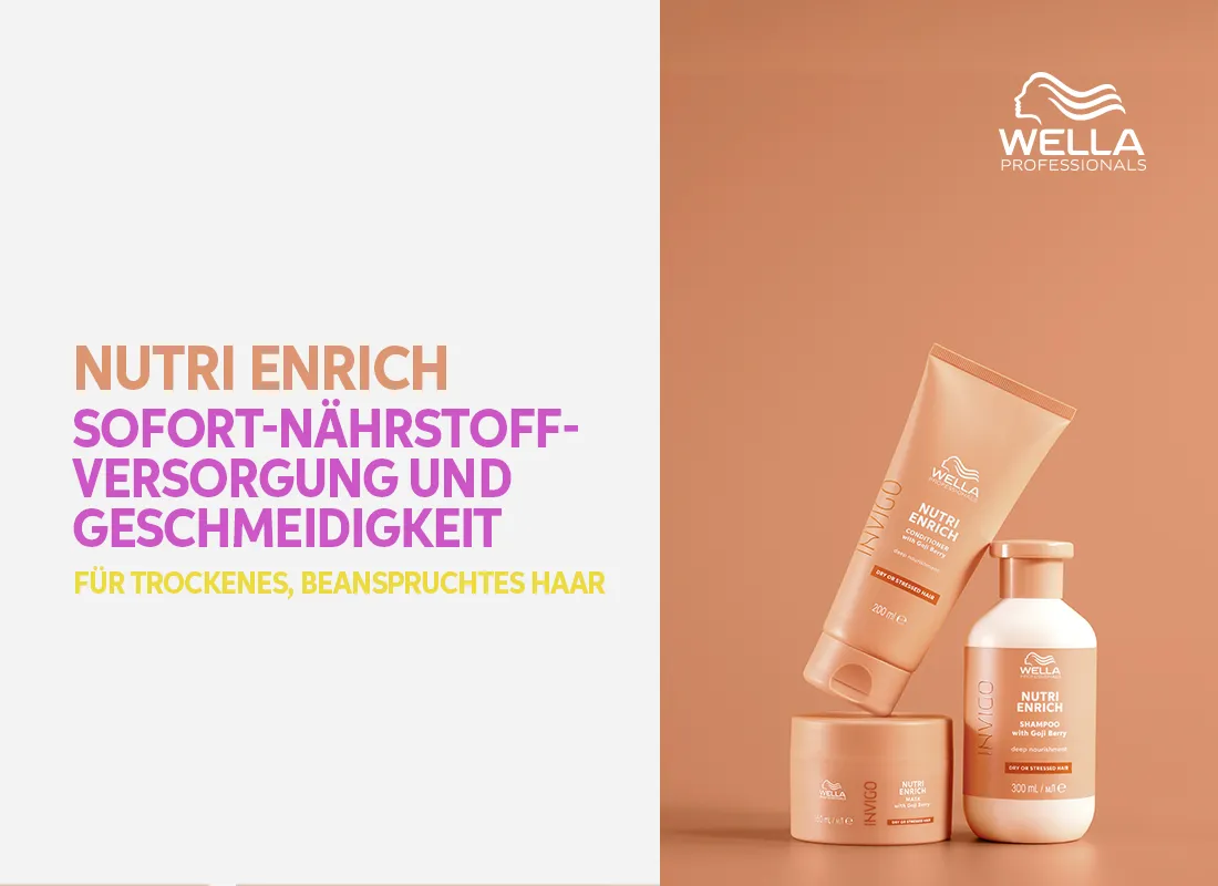 Wella Nutri Enrich reichert trockenes und geschädigtes Haar mit regenerierenden Inhaltsstoffen an. Die Linie sorgt für tiefenwirksame Reparatur vom Ansatz bis in die Spitzen und baut die Haarstruktur nachhaltig auf.